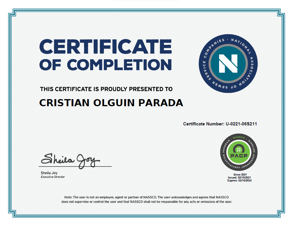 Cristián Olguín Parada, representante oficial de MOO Alcantarillados es miembro NASSCO, con el compromiso de asegurar los estándares de la industria del alcantarillado.